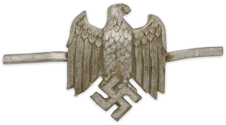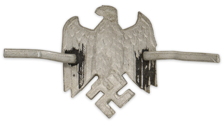 Although military ranks and rank designations can be traced back to the mercenary armies of the 17TH century it wasn’t until the creation of standing armies in the early 18TH century that distinguishing insignia of rank began to be developed. Originally the shoulder straps were functional items designed to secure the saber and ammunition shoulder cross straps and the larger, metal trimmed epaulettes were a throw back to the protective shoulder pieces worn on medieval armor. With the formation of the Imperial Prussian Navy in 1848 Senior NCO’s and Officers ranks adopted a series of rank identifying shoulder insignia for the traditional blue and white uniforms. With the later introduction of the brown tropical uniform and field-grey uniforms for land based personnel the wear of shoulder rank insignia was utilized by all ranks, but only on these specific uniforms. The Imperial Prussian Navy rank shoulder insignia remained in use through the Weimar, Reichsmarine, (National Navy, Circa 1919-1933), era and on into the Third Reich with minor variations. On entering Kriegsmarine service all personnel were assigned and trained for a specific career. These careers consisted of a wide variety of specialty trades and functions with some of the careers restricted to certain rank groups. On successful completion of the appropriate training, personnel were issued distinctive career insignia to be worn on the upper left sleeve of the uniforms and senior NCO’s and Officer’s also utilized cyphers to be worn on the shoulder boards/straps. Generally the shoulder board/strap cyphers were gilt washed although silver colored cyphers were utilized during the war.PHYSICAL DESCRIPTION: Military Administration eagle cypher. Aluminum construction. Both original prongs intact.