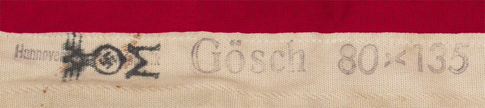 PHYSICAL DESCRIPTION: Roughly, 80cm x 135cm, dual sided, printed, cotton construction flag features a red base field with a a roughly, 58cm diameter, central, white circular disc with a black printed, canted swastika to the center. The fly edge of the flag has a dual ply hem and eight, parallel rows of reinforcement stitching while the top and bottom edges have six, parallel, rows of reinforcement stitching. The hoist edge of the flag has a small, dual ply, rectangular, reinforcement panel to each corner. The hoist edge is trimmed in white, tunnel looped, cotton bunting for the suspension rope. The suspension rope is still intact and is looped at both the top and bottom edges. The bunting is well marked with a black inkstamped, "Eagle over M", indicating Kriegsmarine usage, the designation, "Gösch.", (Jack/Small Nautical Flag), the dimensions in centimeters, "80 x 135", and the manufacturer’s name. This example is a scarce size typically used by Uboats and Schnellboots according to the Kriegsmarine original records data.