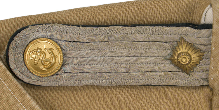BACKGROUND: German Naval uniforms and headgear were based on traditional designs that date back to the creation of the Prussian Navy in 1848, and although the uniforms and headgear did evolve during the interim years, many items used during the Third Reich would still have been quite recognizable to the Imperial sailor. The German navy also had a long tradition of brown and white tropical/landing dress that was worn in hot climates with the white uniform also serving as a walking out dress. The tradition was continued through the Weimar era and in 1929 the Reichsmarine introduced new brown and white tropical/landing dress uniforms with stand up collars. In 1937 the Kriegsmarine introduced new style brown and white tropical uniforms with lay down collars. With the impending entrance into the North African campaign in late 1940 the Kriegsmarine developed another new tropical brown uniform independently from the Heer and Luftwaffe, but retained the 1937 pattern white uniform. Included with the 1940 pattern tropical brown uniform were service tunics, field blouse and both short and long pants. The tropical uniforms were classed as Sonderbekleidungsstücke, (Special Articles of Clothing), and were only issued to personnel serving in tropical climates. Officers and certain senior NCO ranks were responsible for purchasing their own uniforms and headgear and as a result were allotted a clothing allowance through the OKK, Offizier Kleiderkasse der Kriegsmarine, (Officer’s Clothing Account of the Navy). Although enlisted personnel were issued their uniforms and headgear from government supplies they were also permitted to purchase privately tailored items although the price may have been restrictive. Generally speaking officers bought nice quality, private purchase, uniform items but they could also choose to buy their uniforms directly from the military clothing depots.