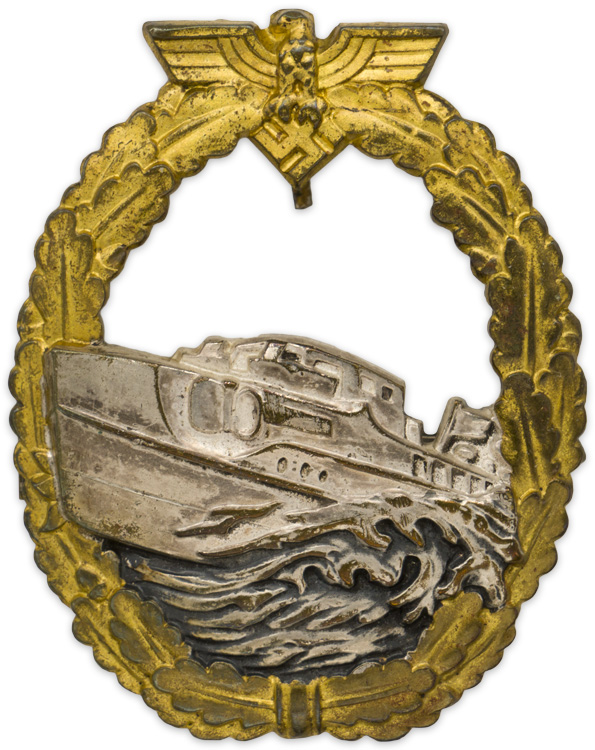 BACKGROUND: Due to restrictions imposed on the German’s as a result of the Treaty of Versailles at the close of WWI, the German Navy was limited to a prescribed number of vessels and were not permitted to construct any further vessels with more then 10,000 tons displacement. The restrictions imposed by the Allies also included the surrender of all German submarines with no further submarines to be constructed. On evaluating the use of torpedoes during WWI the German Navy High Command came to the conclusion that a small, fast, surface vessel equipped with torpedoes would help balance out the deficiencies that the navy was forced to endure in comparison to other potentially enemy navies. This resulted in the construction of a variety of small, fast Schnellboot’s, (Patrol/Torpedo Boats), with torpedo capability. These Schnellboot’s were manufactured at both the Lürssen and Vegesack shipyards and ranged from 23 to 105 tons of displacement, well under the Treaties size/weight restrictions. By the end of the war the Germans had produced two hundred forty-nine S-Boats. On May 30TH 1941, Oberbefehlshaber der Kriegsmarine und Großadmiral, (Commander in Chief of the Navy and Grand Admiral), Erich Raeder introduced the S-Boat War Badge for award to S-Boat personnel who met the required criteria. The main criteria for bestowal of the badge was a minimum of twelve sorties against the enemy. Prior to the introduction of the, S-Boat War Badge, S-Boat personnel were awarded the Destroyers War Badge if they fulfilled the required criteria. Of Note: A second pattern S-Boat War Badge, with minor variations, was introduced in January 1943. The introduction of the second pattern badge resulted in this first pattern badge only being in active circulation for nineteen months although personnel awarded the first pattern badge would have continued to wear it through-out the war. Also Of Note: In popular collector terminology these badges are most often referred to as the E-Boat Badge, utilizing the English WWII designation with the "E" indicating, "Enemy".