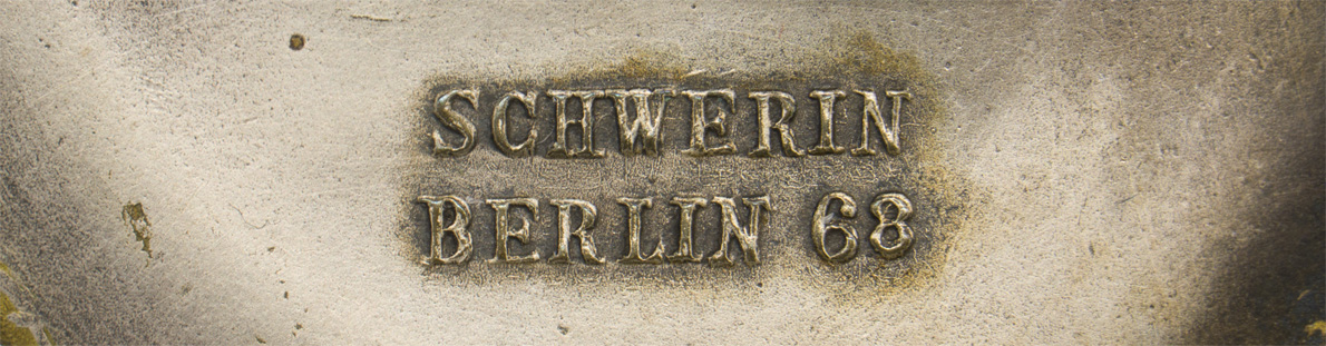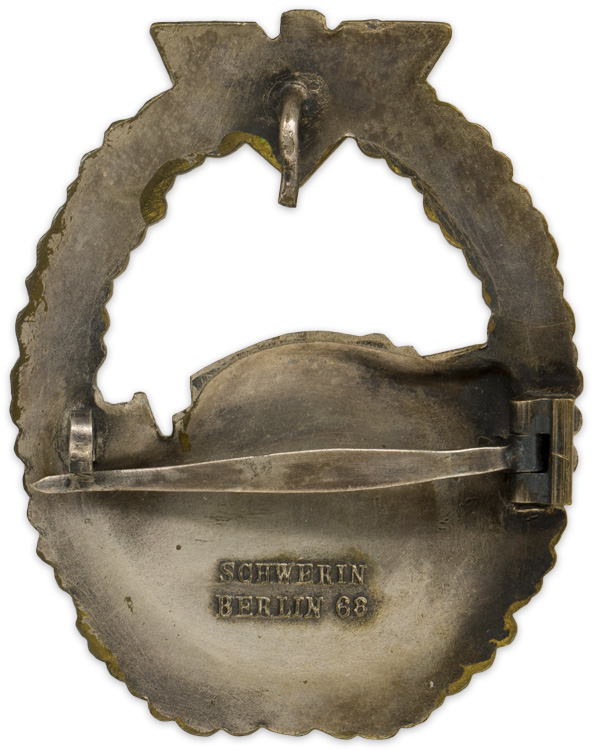 PHYSICAL DESCRIPTION: Nice quality, die struck alloy, partially scooped backed, first pattern S-boat badge with fire gilted, nickel/silver plated and burnished silver finishing. The badge is in the form of a vertically oval, oak-leaf wreath with a small national eagle with out-stretched wings superimposed to the top center, encompassing a short length, tall silhouette, S-boat, cutting through the waves. The badge is nicely detailed with the forward torpedo tube, pilots bridge and a flag all clearly visible. The boat and the waves both overlap the oak-leaf wreath. The reverse of the badge has a subtle recessed scoop to the reverse of the boat. The reverse has a soldered, solid hinge, a horizontal, broad tapering pin, a heavy soldered catch and a small vertical retaining hook all intact. The reverse is well marked with embossed manufacturers name and location, "Schwerin Berlin 68".