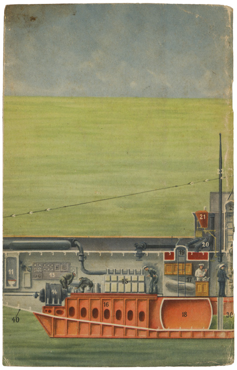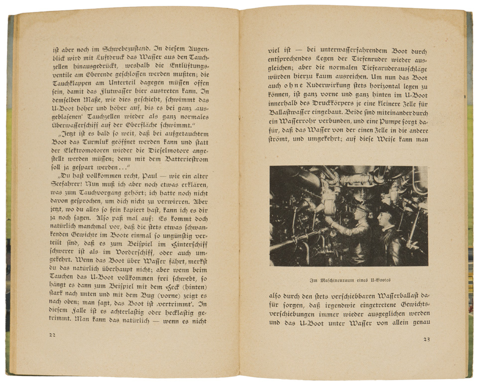 PHYSICAL DESCRIPTION: Roughly 20cm x 13cm, forty page, unofficial training book compiled by, "Korvettenkapitän (Ing.) Max Bartsch", and published by, "Wilhelm Limpert", in Berlin in 1940. The mid-weight card stock cover of the book has a full color, cut-away drawing of a submarine with all the components numerically marked, from one to forty, with a corresponding glossary list of the individual components. The front cover also has the black printed title, "Was jeder vom deutschen U-Boot wissen müß", (What every German U-Boat Personnel must know). The text examines all the basic information required for personnel serving on a U-Boat including both offensive and defensive weapons. The book has five black and white photographs and three line drawings that reinforce the text. The book is in overall good condition with the pages showing minor age yellowing but they are all intact.