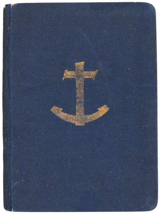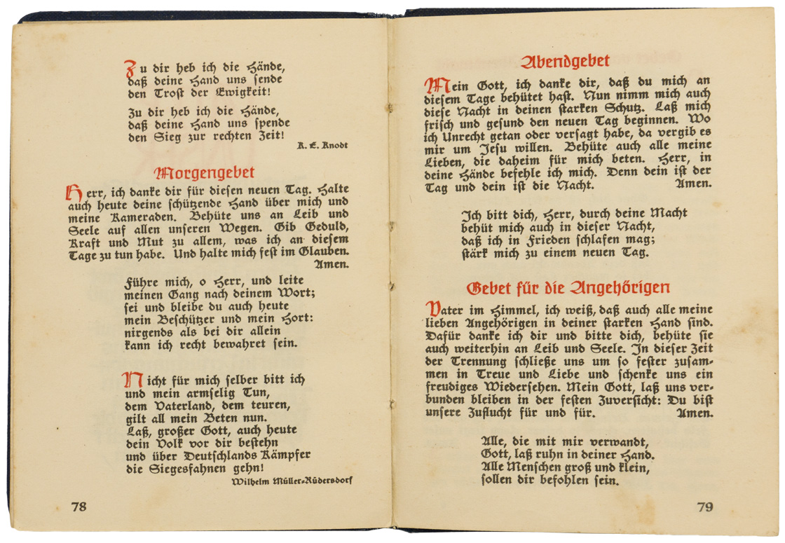 A 9.5cm x 13cm hymnbook titled " Gesangbuach für die Kriegsmarine" that consists of 100 pages. Shows typical usage and wear.