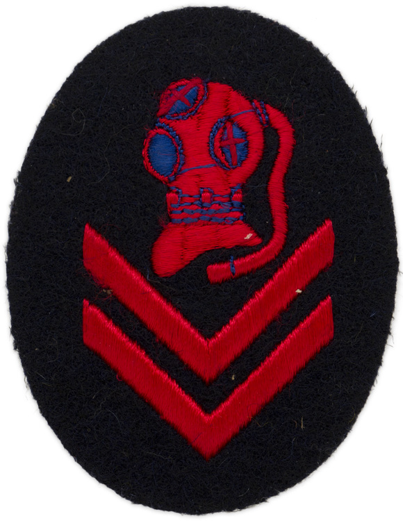 PHYSICAL DESCRIPTION: The 1940 pattern insignia consists of a roughly, 95mm tall, 70mm wide, vertically oval, navy blue wool base with a machine embroidered, divers helmet positioned above dual chevrons in bright red cotton threads with mid-blue, detailing, accent threads to the helmet.