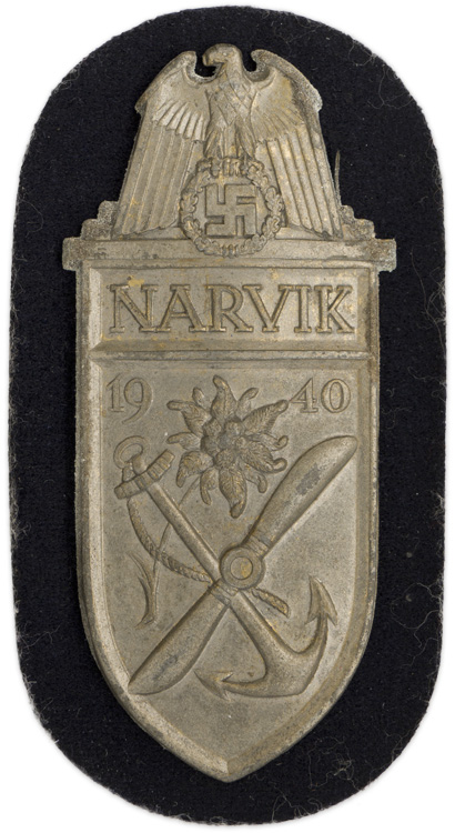 PHYSICAL DESCRIPTION: Die stamped, zinc construction with a gilt wash, shield featuring an embossed, stylized, national eagle with down-swept wings, clutching a wreathed, static swastika in its talons, to the top center, positioned above the embossed script, "Narvik 1940", an edelweiss flower and a crossed propeller and anchor. The edelweiss, propeller and anchor represent the Heer Gebirgsjäger, (Army Mountain troops), the Kriegsmarine and the Luftwaffe respectively, that participated in the victory at Narvik. All original prongs and backing material are intact. Type "1" example.