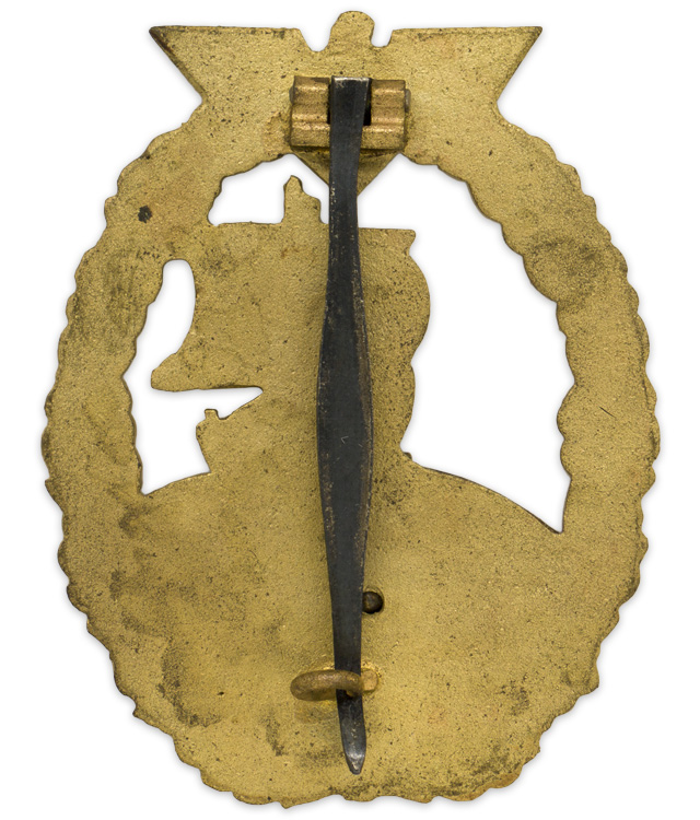 PHYSICAL DESCRIPTION: Two piece, die struck, tombak construction badge with fire gilt and nickel/silver plated finishes. The badge is in the form a gilt washed, vertically oval, embossed, oak-leaf wreath with a national eagle with out-stretched wings, clutching a canted, swastika in it’s talons, superimposed to the top center, encompassing a cut-out, "Viking" style, long boat with full sail, cruising on a separate likeness of a nickel/silver plated, northern portion of the globe. The detailing includes the dragon figurehead and oval shields on the ship, longitude and latitude lines and the embossed outline of Great Britain, Western Europe and North Africa on the globe. The separate globe is attached to the badge by a single, small, dome headed, rivet which is visible on the reverse. The reverse has a soldered, solid, block type hinge, a broad, tapering, vertical pin and a heavy, soldered, retaining catch all intact. Unmarked Juncker production. Complete with original box.