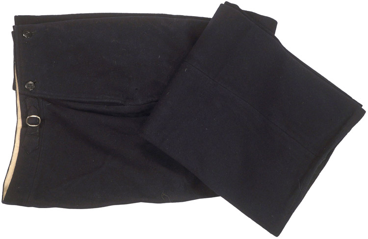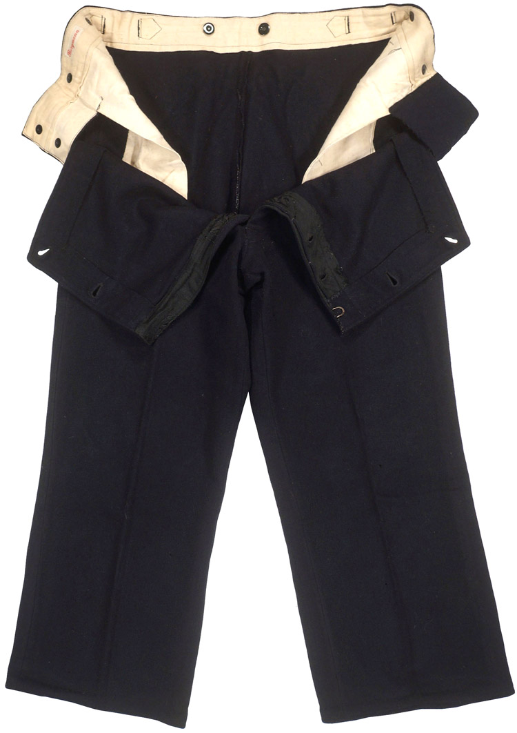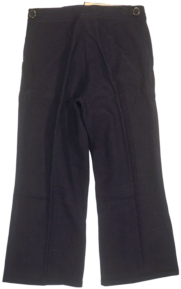PHYSICAL DESCRIPTION: Nice quality, deep navy blue wool/rayon construction straight legged, long pants feature the unique, naval style, front closure in the form of a horizontally rectangular, fold down, front yoke panel with four stitched button eyelets to the top edge with corresponding buttons positioned on the exterior waistband. All original buttons. The pants are roughly size 32" waist. Nicely named.