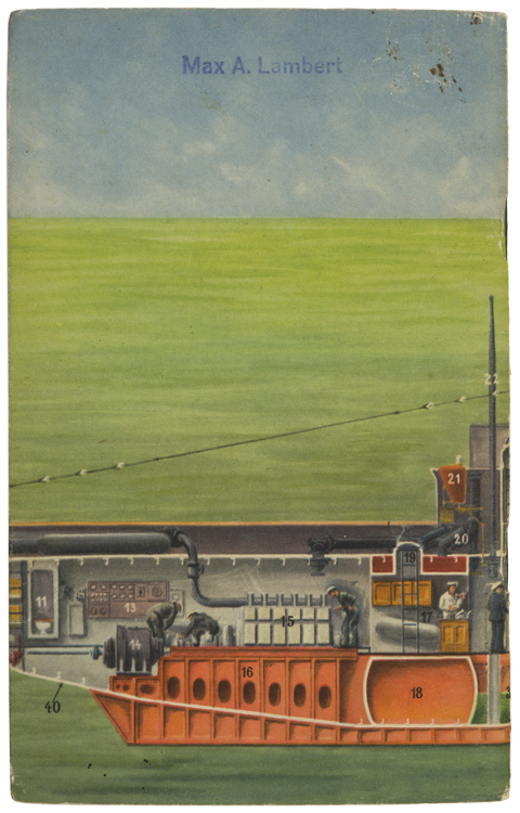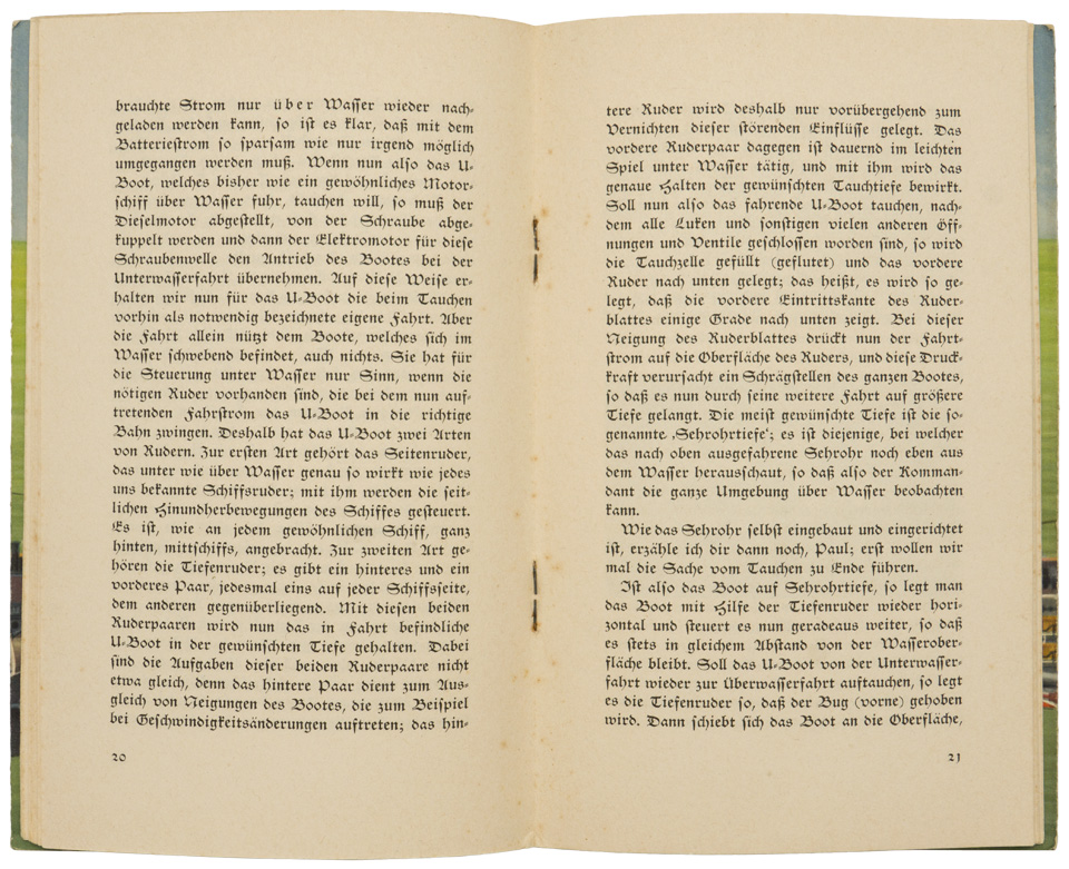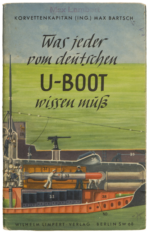 PHYSICAL DESCRIPTION: Roughly 20cm x 13cm, forty page, unofficial training book compiled by, "Korvettenkapitän (Ing.) Max Bartsch", and published by, "Wilhelm Limpert", in Berlin in 1940. The mid-weight card stock cover of the book has a full color, cut-away drawing of a submarine with all the components numerically marked, from one to forty, with a corresponding glossary list of the individual components. The front cover also has the black printed title, "Was jeder vom deutschen U-Boot wissen müß", (What every German U-Boat Personnel must know). The text examines all the basic information required for personnel serving on a U-Boat including both offensive and defensive weapons. The book has five black and white photographs and three line drawings that reinforce the text.