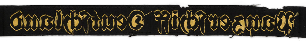 PHYSICAL DESCRIPTION: Post-November 1936, pattern, woven black rayon construction cap talley with machine woven Gothic script, "Panzerschiff Deutschland", in gold celleon threads. Talley has been cut to 49cm and looks to have been sewn to a trophy blanket at one time.
