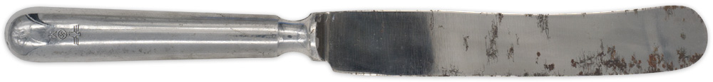 PHYSICAL DESCRIPTION: Two piece, stainless steel and aluminum construction mess hall/galley table knife. The roughly, 10 1/8" long knife has a 4 1/2" long, rounded natural aluminum construction handle with an inserted, 5 1/8" long, rounded tip, stainless steel blade. The obverse of the handle is well marked with an impressed Eagle over "M", indicating Kriegsmarine issue. The blade is also well marked with impressed stylized manufacturers initials, "HL", and date, "1942".