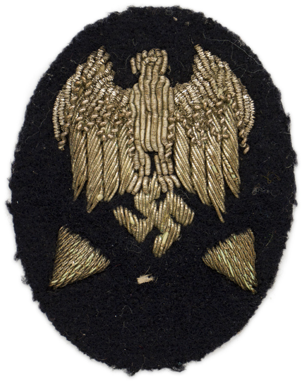 PHYSICAL DESCRIPTION: The Technical Officials, elevated grade career insignia consists of a roughly, 50mm tall, 40mm wide, vertically oval, navy blue wool base with a hand embroidered Wehrmacht pattern national eagle with down swept wings, clutching a canted swastika in it’s talons, in bright silver/aluminum wire and bullion threads. The eagle is positioned above two, career grade, identifying triangles, also hand embroidered in bright, silver/aluminum wire threads. The reverse of the insignia still has its original protective tan paper backing semi-intact. (Ex Philippe Gillain Collection)