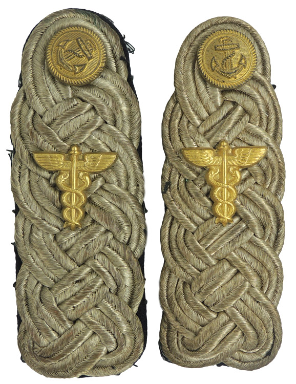 (Schulterstücke)BACKGROUND: Although military ranks and rank designations can be traced back to the mercenary armies of the 17TH century it wasn’t until the creation of standing armies in the early 18TH century that distinguishing insignia of rank began to be developed. Originally the shoulder straps were functional items designed to secure the saber and ammunition shoulder cross straps and the larger, metal trimmed epaulettes were a throw back to the protective shoulder pieces worn on medieval armor. With the formation of the Imperial Prussian Navy in 1848 Senior NCO’s and Officers ranks adopted a series of rank identifying shoulder insignia for the traditional blue and white uniforms. With the later introduction of the brown tropical uniform and field-grey uniforms for land based personnel the wear of shoulder rank insignia was utilized by all ranks, but only on these specific uniforms. The Imperial Prussian Navy rank shoulder insignia remained in use through the Weimar, Reichsmarine, (National Navy, Circa 1919-1933), era and on into the Third Reich with minor variations. On entering Kriegsmarine service all personnel were assigned and trained for a specific career. These careers consisted of a wide variety of specialty trades and functions with some of the careers restricted to certain rank groups. On successful completion of the appropriate training, most personnel were issued distinctive career cypher insignia to be worn on the shoulder boards/straps.