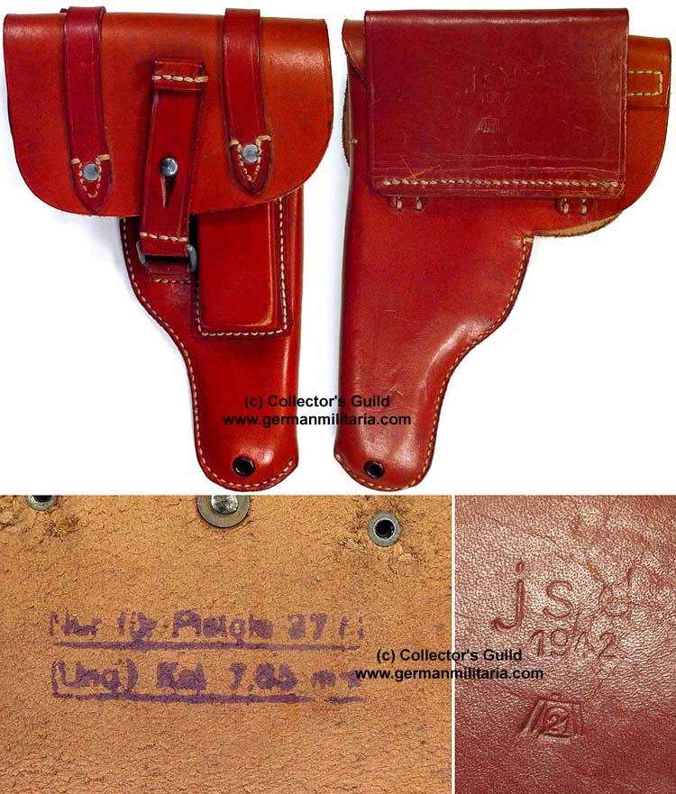 PHYSICAL DESCRIPTION: Smooth, molded, tan leather construction holster with steel fittings features a fold over top flap with a horizontal machine stitched seam to the reverse and a steel stud to the obverse. The front left side body of the holster has a vertical closure strap with a single stud eyelet secured in place by a rectangular swivel steel ring. The closure strap was designed to affix to the stud on the top flap for a secure closure. The right front side of the holster body has a stitched on, spare magazine pocket. Both the obverse and reverse bottom tip of the holster has an inserted steel grommet. The holster has a unique belt loop attachment consisting of two vertical straps machined stitched to the reverse, running over the top flap and riveted to the obverse which secures a wide, horizontal, sliding belt loop. The reverse of the holster is well marked with an impressed Luftwaffe style waffen-amt and the manufacturers code and date, "jsd 1942", indicating manufacture by, Gustav Reinhardt Lederwarenfabrik of Berlin. The interior of the holster is also well marked with blue inkstamp script that appears to be, "Nur für Pistole 37 M (Ung.) Kal. 7,65mm", (Only for Pistol Model 37 (Hungarian) Caliber 7.65mm). The holster is in overall very good condition with minor chafe wear and minimal age and usage toning.