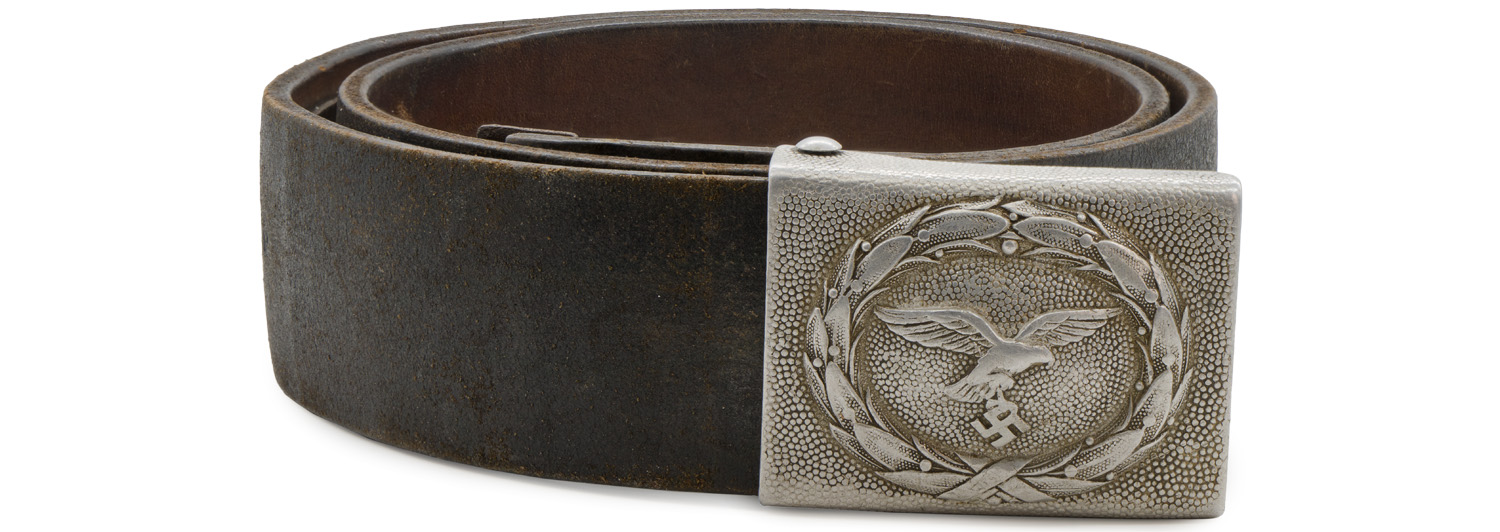 BACKGROUND: Military belts and their corresponding buckles date back centuries and were initially designed for attaching swords and daggers. In 1847 a new innovative box buckle with a quick release catch and corresponding belt were introduced which resulted in a Prussian, Hauptmann Virschow, initiating a new method of carrying personal equipment with the belt and shoulder straps supporting the majority of the weight. This system, with modifications, remains in use in most of the armies in the world to this day. During the Third Reich there was a prescribed form of wear of the belt and buckle with the buckle being positioned on the right side and the corresponding buckle catch on the left side. First introduced on May 20TH 1935, the Luftwaffe EM/NCO’s belt buckle underwent minor modifications in late 1937 or early 1938 with a new pattern eagle and again in 1940 with a slight difference in construction. Of Note: Luftwaffe personnel initially utilized brown leather accoutrements but during the war the leather items were generally blackened.