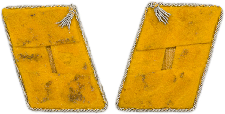 BACKGROUND: The Reichsluftwaffe was officially established on February 26TH 1935 as the third branch of service of the German Armed Forces. On March 9TH 1935 the formation of the new Reichsluftwaffe was announced to the foreign press and on March 16TH conscription was reintroduced for all three branches of service. On May 21ST 1935 the Reichsluftwaffe designation was altered to Luftwaffe. Collar tabs were adopted by the newly formed Luftwaffe on April 14TH 1935 and followed the basic pattern of the collar tabs that had been utilized by its earlier civilian forerunner the, DLV, Deutscher Luftsport Verband, (German Air Sports League). The collar tabs were worn in matching pairs and indicated the branch of service and rank of the wearer. The different branches of service within the Luftwaffe were allocated a specific identifying waffenfarbe, (Branch of Service Color), with golden yellow being chosen for personnel serving with Flieger, (Flight), units, which was generally displayed as the base color of the collar tabs.