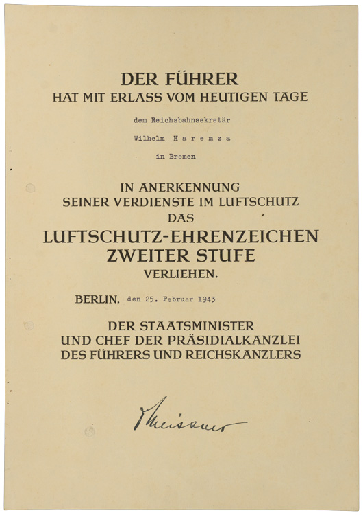 PHYSICAL DESCRIPTION: A 21cm x 30cm award document "awarded the Reichsbahn Secretary Wilhelm Haremza in Bremen the second-level Air Protection Medal in recognition of his services in air protection." Awarded in Berlin on February 25, 1943. Office stamp and signature to bottom of document.