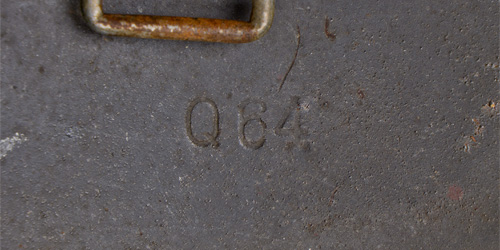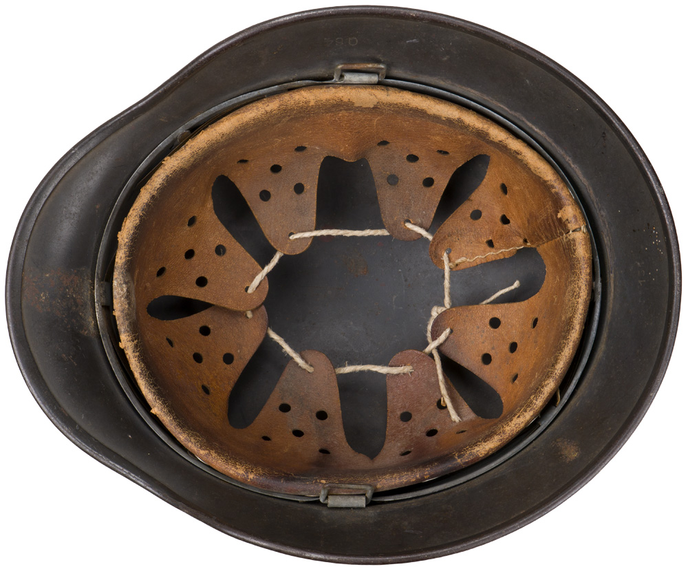 PHYSICAL DESCRIPTION: The stamped, sheet steel construction helmet retains a good portion of its original grey paint. The left side of the helmet has a second pattern, (Circa 1936/1937-1945), black detailed, silvery/white, Luftwaffe eagle decal, clutching a canted swastika in one talon. The decal is retained 96%. All three liner retaining rivets are intact. The interior of the helmet has a M31 leather liner with all eight of it’s fingers intact and size adjustment tie-string. The reverse, interior, neck guard apron is stamped, "DI 131" and the interior, left side, apron has the stamped manufacturer’s code and size, "Q64", indicating manufacture by F.W. Quist, G.m.b.H. Esslingen, size 64.