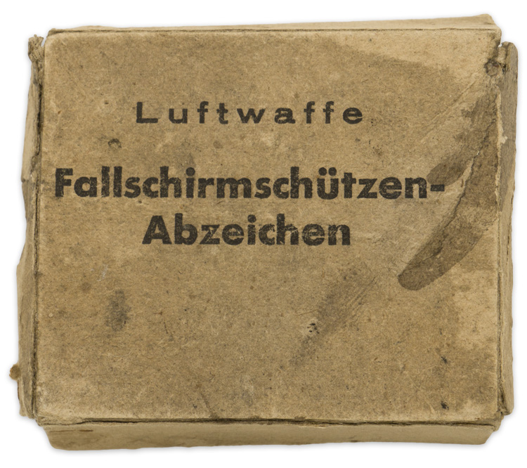 PHYSICAL DESCRIPTION: Cardstock construction 7cm x 5.5xm x 2cm. Well marked "Luftwaffe Fallschirmschützen-abzeichen". Corner staples are missing. Shows its age. Missing from most Para badge collections. Scarce!