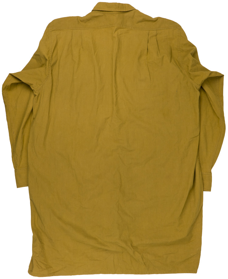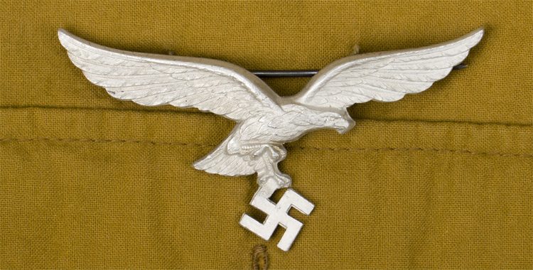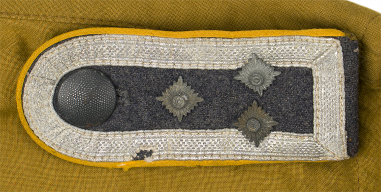 PHYSICAL DESCRIPTION: Early pattern, light weight, tan cotton construction, long sleeve, pullover shirt with an integral lay down collar. The shirt features a vertical, four button, front closure plaquet which runs from the neckline down to the waistline. The shirt has two pleated, patch, breast pockets with scalloped button down flaps. Over the right pocket is a Silver washed, solid backed, alloy construction, second pattern, (Circa 1937/38-1945), Luftwaffe breast eagle clutching a canted, swastika in it’s talons. The eagle shows nice detailing and has a wingspan of roughly, 85mm from wing tip to wing tip. The solid reverse has an integral hinge, a thin round horizontal pin and catch with a circular base plate all intact. Eagle is attached with the original thread loops above the pocket. Original loops for four badge and one ribbon bar. The sleeves each have a seven, small, vertical tapering darts and a vertical outer seam slash at the cuffs with double button closures. Comes with a pair of slip on yellow piped Stabsfeldwebel shoulder straps. The shirt is roughly size 48" chest. Super nice!