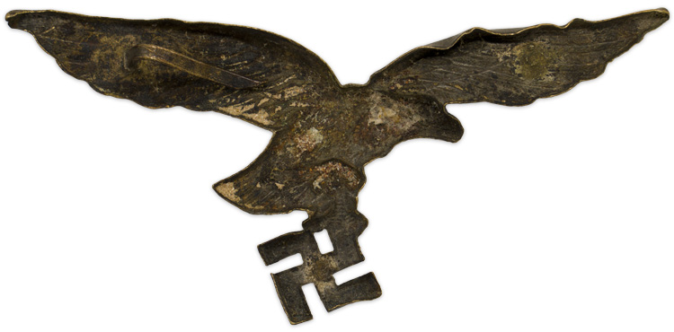PHYSICAL DESCRIPTION: Stamped alloy construction, second pattern, (Circa 1936/1937-1945), Luftwaffe eagle clutching a canted, swastika in one talon has a roughly, 68mm wingspan from wing tip to wing tip. Top of the wing has some dents. One prong remains.