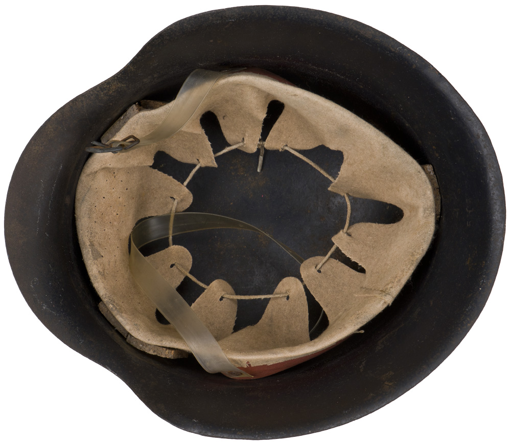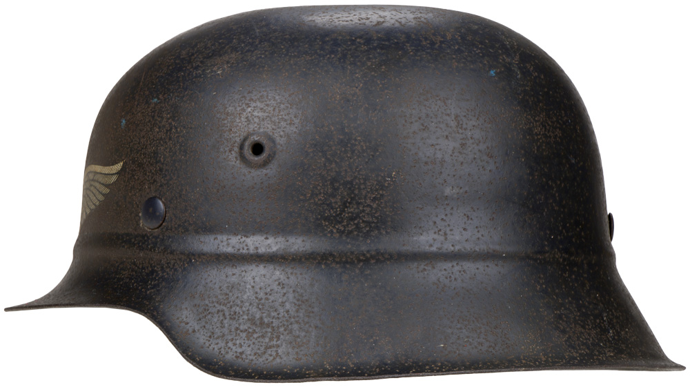 PHYSICAL DESCRIPTION: Stamped sheet steel construction, M42 style helmet with the addition of an embossed horizontal "bead" positioned at the apex of the front and rear visors and crown. The helmet retains a good portion of its original blue/grey finish with the expected crown wear. The front center of the helmet has a Luftschutz emblem decal in place. The black detailed, silver decal features stylized spread wings with a central oak-leaf sprig and a canted swastika positioned below a scripted banner, "Luftschutz". The helmet has an embossed cut-out ventilation hole to each side of the crown and all three of the liner retaining rivets are intact. Original ersatz liner and chinstrap are complete. Liner is a bit miss-shaped, but all complete. Maker marked size "EF66" indicating manufacture by Emaillierwerk, AG Fulda, size 66. M42 beaded examples are fairly scarce to find. Decent example showing honest period wear.