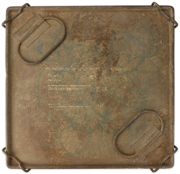 PHYSICAL DESCRIPTION: Roughly, 21" tall, 15" square, field-grey painted, magnetic sheet metal construction, container with a vertical brazed seam to one side and a brazed on bottom panel. The container has a removable top lid with a brazed on, swivel hinge, steel, carrying handles to two corners. The top edge of all four side corners each have a brazed on, swivel hinged, heavy steel wire, pressure, closure clips to secure the top lid to the container. The top lid is well marked with faint, mostly illegible, white stenciled script that includes, "Wetterfester Behälter für Fallschirmgerät", (Weatherproof Container for Parachute Equipment), "Bauart:", (Type of construction), "Hersteller", (Manufacturer), "Anforderzeichen", (Requisition number), "Gerät-Nr", (Equipment number), and "Werk-Nr.", (Work number). Unfortunately the corresponding type of construction, manufacturer, requisition number, equipment number, and work number are not visible. The interior of the top lid still has its original black rubber weatherproofing seal intact. The container retains about 88% of its original age darkened field-grey paint with small areas of light to moderate surface spotting and additional areas that appear to have been exposed to a high heat resulting in surface cracking and bubbling to the paint. The container also has a few tar remnants and numerous small dings and dents.
