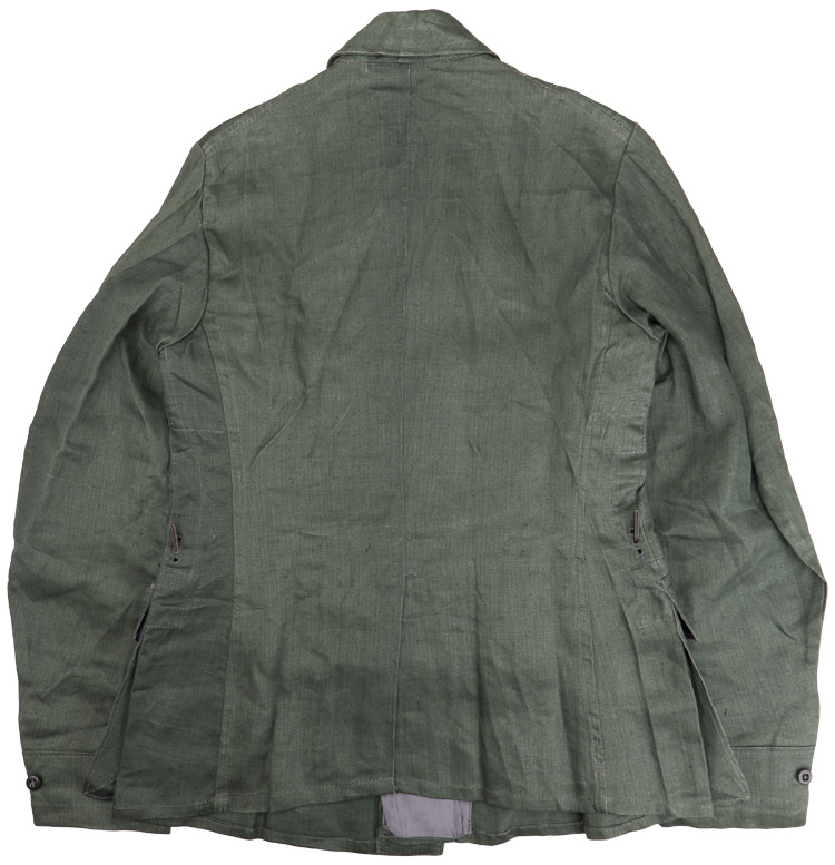 BACKGROUND: The first HBT, (Herring Bone Twill), garments introduced for use by Luftwaffe EM/NCO personnel were the blue/grey drill and black work uniforms introduced in April 1936 and July 1937 respectively in order to conserve wear and tear on the wool and wool blend uniforms. Although the drill and work uniforms were designed for different functions both garments were almost identical in cut and construction. The HBT garments were favored by the troops and began to be worn in the field as a summer uniform. Generally the HBT garments utilized as the summer combat blouse followed the basic modifications of the standard issue wool garments. Regulations of September 27TH 1943 abolished the blue/grey and black HBT uniforms replacing them with a reed green HBT uniform as utilized by army personnel. The alteration to the reed green HBT uniforms was a time and cost saving measure eliminating the need for different colored uniforms for Luftwaffe and Army personnel. Officers and certain senior NCO ranks were responsible for purchasing their own uniforms and as a result were allotted a clothing allowance through the Luftwaffe’s Verkaufsabteilung, (Air-Force Sales Department), system. The Officers and certain senior NCO’s could choose to purchase their uniforms from the armed forces clothing depots or to privately purchase uniform items of higher quality. Although enlisted personnel were issued their uniforms from government supplies they were also permitted to purchase privately tailored uniforms although the price may have been restrictive.