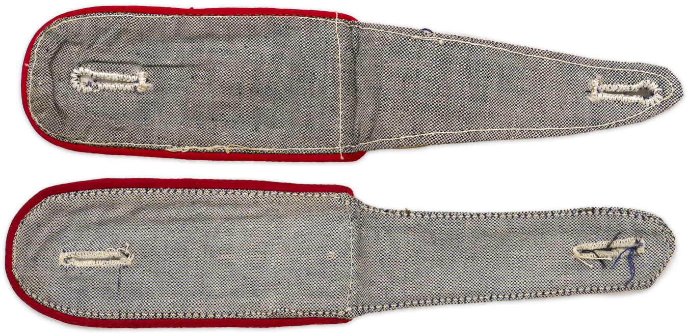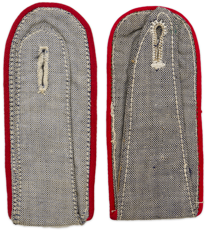 PHYSICAL DESCRIPTION: Light weight, flecked blue/grey cotton construction, slip on shoulder straps with bright red rayon waffenfarbe piping. The bottom of the straps and the slip on retaining tongues are also in light weight, flecked blue/grey cotton.