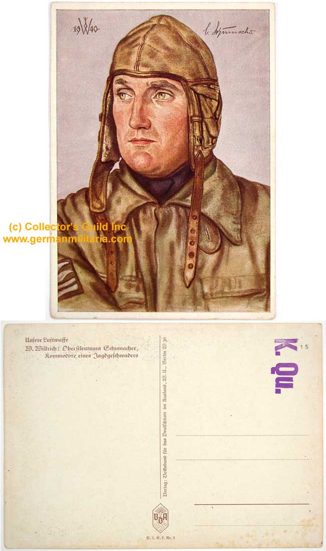 (Kunstwerk Postkarte)BACKGROUND: Artwork, as a propaganda tool, was widely used during the Third Reich and Hitler’s own humble artistic background also helped foster a general interest in German art. Many art exhibitions were held through-out German during the time period with the largest being held annually, ever summer from 1937 to 1944, at the German House of Art in Munich. As early as 1938 the OKW, Oberkommando der Wehrmacht, (High Command of the Armed Forces), actively began recruiting artists who were assigned to a units Propaganda Company along with photographers and journalists. By the end of the war almost two hundred war artists had served in the Wehrmacht. One of the most prolific, and as a result one of the best known German war artists was Feldwebel Wolfgang Willrich. Willrich a WWI veteran, had volunteer for military service prior to the outbreak of WWII but had been rejected on the basis of his age, (42), and was assigned to Landwehr I as a trained reserve. Through his personal friendship with Erwin Rommel, Willrich was able to secure a position in the OKH visual arts section of the Propaganda department. In this position Willrich painted and drew numerous personalities and regular soldiers in all branches of service through-out the war. Many pieces of his artwork were featured on assorted series of postcards developed by the "VDA, "Volksbund für das Deutschtum im Ausland", (National League for Germans Abroad), among others. The VDA was originally a pre-war organization formed to assist German nationals living in foreign countries and during the Third Reich era the VDA was taken over by the NSDAP and placed under the jurisdiction of the SS. In mid-1942 the OKH decided to have portraits of all the Knight’s Cross of the Iron Cross holders and Willrich was assigned the task. Of Note: Oberstleutnant and Commander of Fighter Wing 1, Carl-August Schumacher was awarded a Knight’s Cross of the Iron Cross on July 21ST 1940. Schumacher was promoted to the rank of Generalmajor in January 1944 and survived the war.