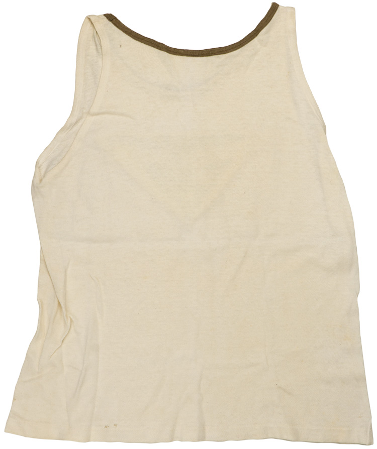 PHYSICAL DESCRIPTION: Stretchy, standard issue, white tricot construction, tank top style, sports shirt with vertical side seams and low, circular, boat-cut neck line. Front center of shirt has a black, machine woven, M35 pattern, Luftwaffe sport shirt eagle on an inverted, ribbed white rayon, triangular base. Base is machine stitched to shirt. Interior neck and sleeve openings are lined in white cotton tape and shirt tail is hemmed. The chest measures approximately 36". The darl collar ring indicates NCO rank. NCO examples don’t turn up often.