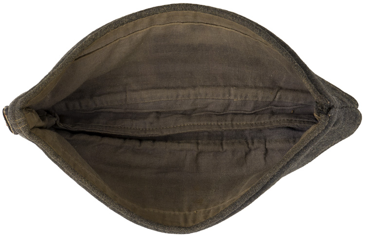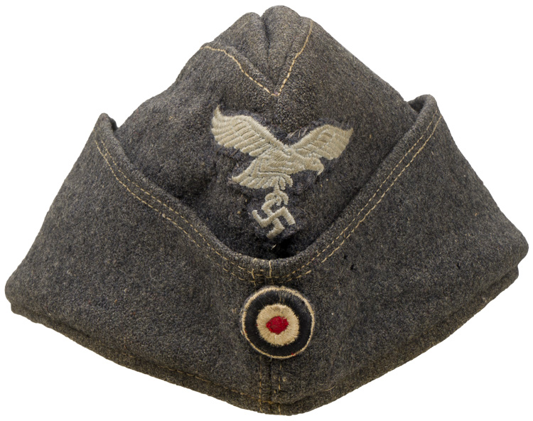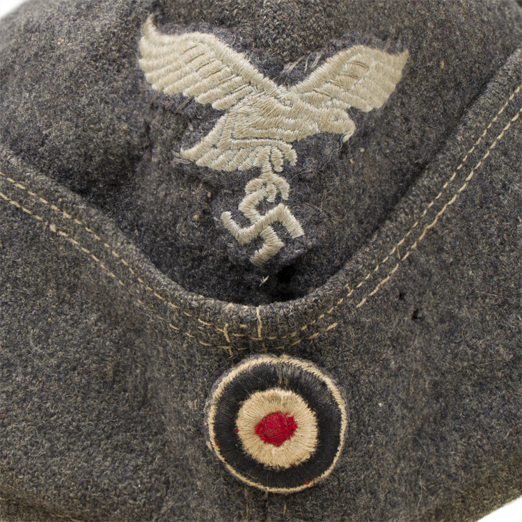 PHYSICAL DESCRIPTION: Luftwaffe blue/grey, wool/rayon blend construction cap features fold down side and back panels with gently sloping, downward scallops to the front and forward sides. The front center of the cap has a machine embroidered, second pattern, (Circa 1936/1937-1945), Luftwaffe eagle clutching a canted, swastika in one talon, in pale silvery/grey cotton threads mounted on a cut-out, blue/grey, wool base and the front center of the fold down panels has a machine embroidered, national tri-color cockade in black, white and red rayon threads. Both the eagle and the cockade are neatly handstitched in place. The interior of the cap is fully lined in blue/grey cotton/rayon. Roughly a size 58.
