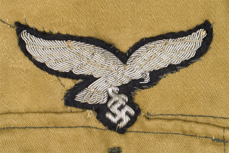 BACKGROUND: The Reichsluftwaffe, (National Air-Force), was officially established on February 26TH 1935 as the third branch of service of the Wehrmacht, (Armed Forces). On March 9TH 1935 the formation of the new Reichsluftwaffe was announced to the foreign press and on March 16TH conscription was reintroduced for all three branches of service. On May 21ST 1935 the Reichsluftwaffe designation was altered to Luftwaffe, (Air-Force). In late 1940, with the impending German entrance into the North African campaign, the army quickly developed and issued tropical uniforms and equipment in time for DAK, Deutsches Afrika Korps, (German Africa Corps), personnel’s arrival in Tripoli in February 1941. At the same time the Luftwaffe also developed and introduced their own version of the tropical uniform and equipment independently from the other branches of service. Originally the tropical uniforms were only intended for wear in North Africa but that was later expanded to include personnel serving in southern areas of continental Europe during the summer months, (May 1ST to September 30TH). The design of the tropical uniform was based on the standard continental uniform but were in tan as opposed to the continental blue/grey and were usually manufactured in light weight cotton. The Luftwaffe tropical uniform remained basically unchanged for the duration of the war with minor modifications. Regulations dictated that collar tabs were not to be worn on the tropical tunics/field blouses and additional regulations restricted mixing the continental blue/grey uniform items and insignia, with the tropical tan uniform items and insignia although period photographs indicate that both regulations were not strictly adhered to. The different branches of service within the Luftwaffe were allocated specific, identifying, waffenfarbe, (Branch of Service Color), with golden yellow being chosen for personnel serving with the Flieger, (Flight) units which was generally displayed as piping on the shoulder strap/boards of the tropical field blouses and service tunics. Officers and certain senior NCO ranks were responsible for purchasing their own uniforms and as a result were allotted a clothing allowance through the Luftwaffe’s Verkaufsabteilung, (Air-Force Sales Department), system. The Officers and certain senior NCO’s could choose to purchase their uniforms from the armed forces clothing depots or to privately purchase uniform items of higher quality. Although enlisted personnel were issued their uniforms from government supplies they were also permitted to purchase privately tailored uniforms although the price may have been restrictive.