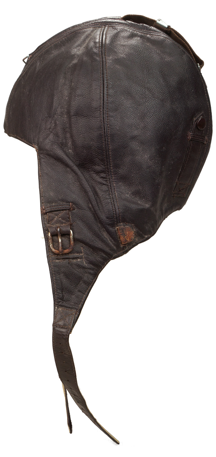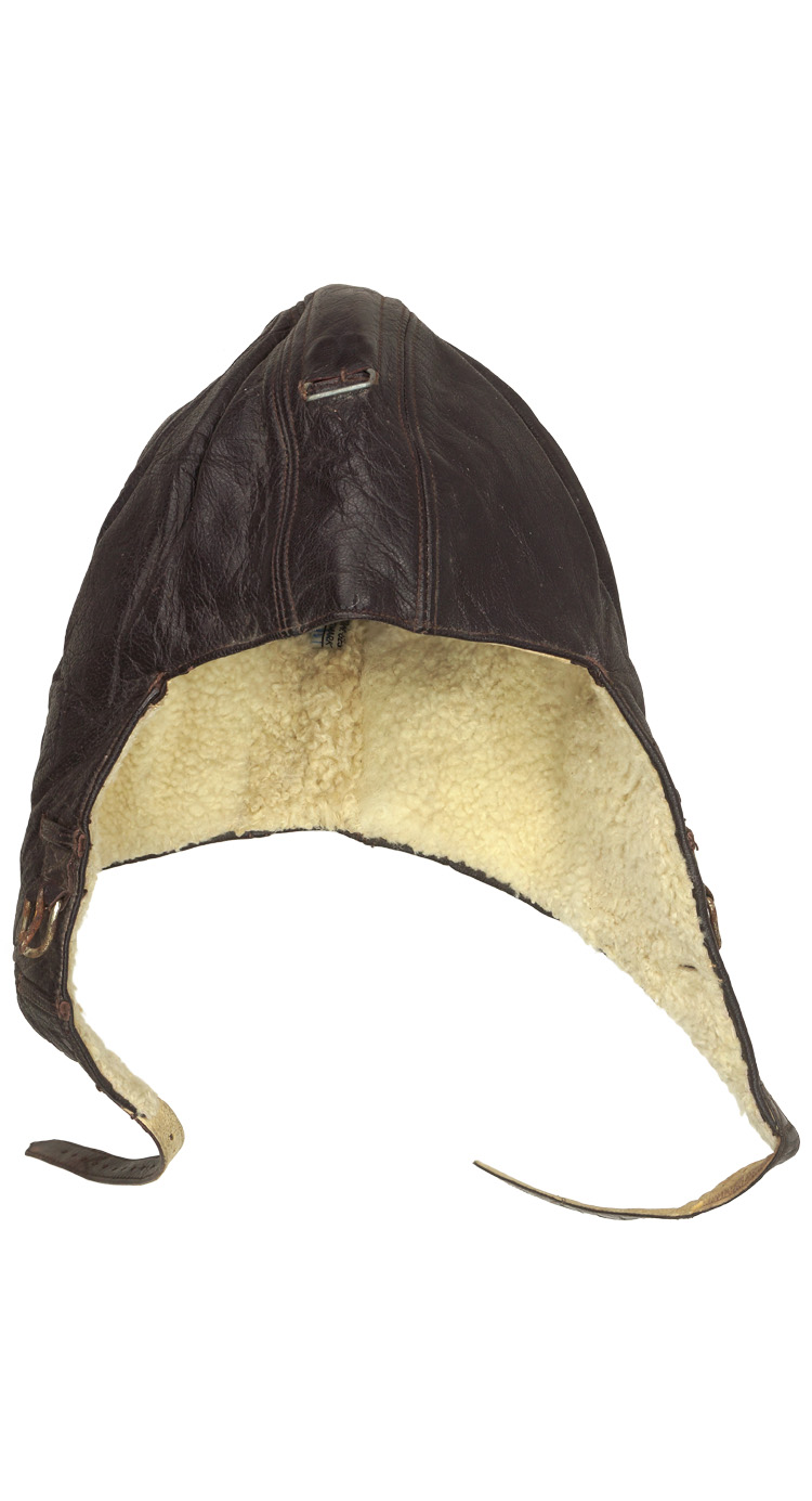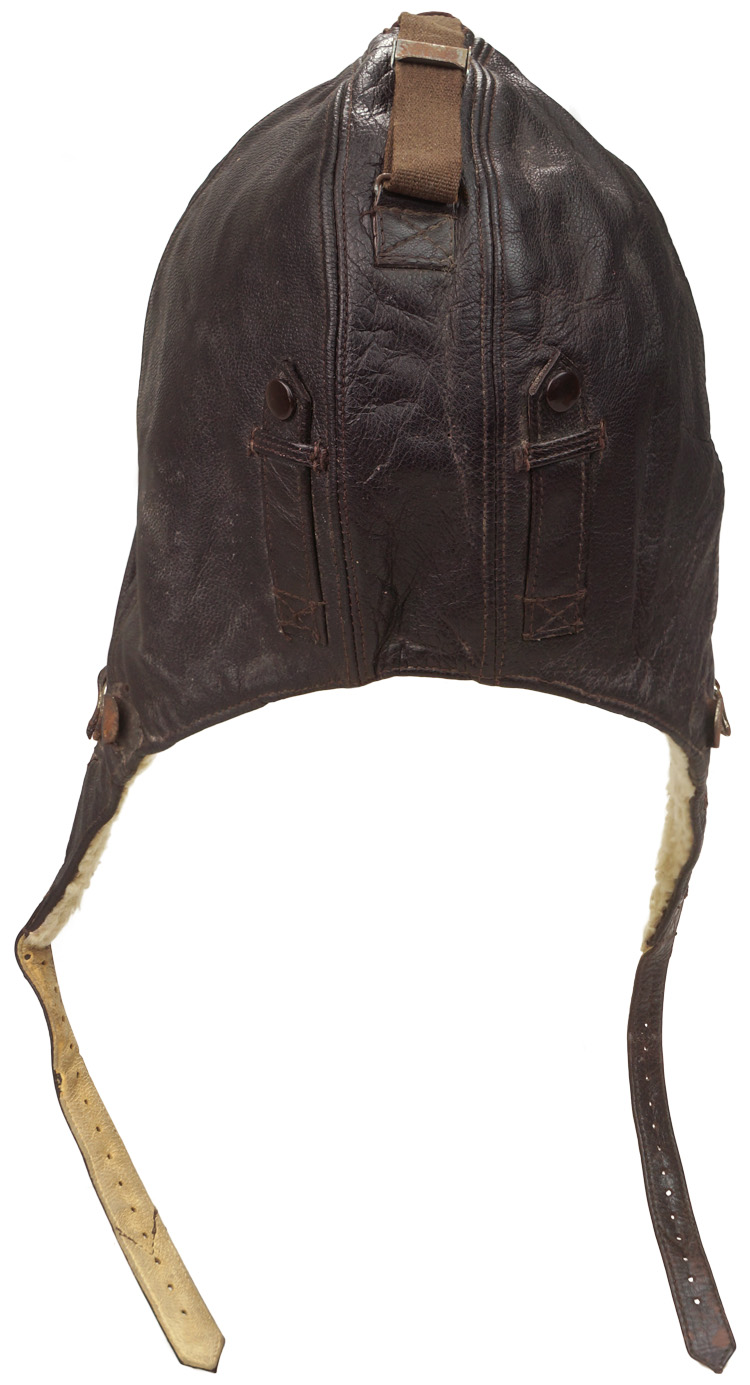 PHYSICAL DESCRIPTION: Nice quality, five panel, brown, grained kid leather construction winter flight helmet with magnetic sheet metal and alloy fittings and a white sheep’s wool lining. All complete and in excellent condition. Size marked 57.