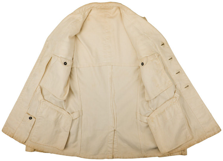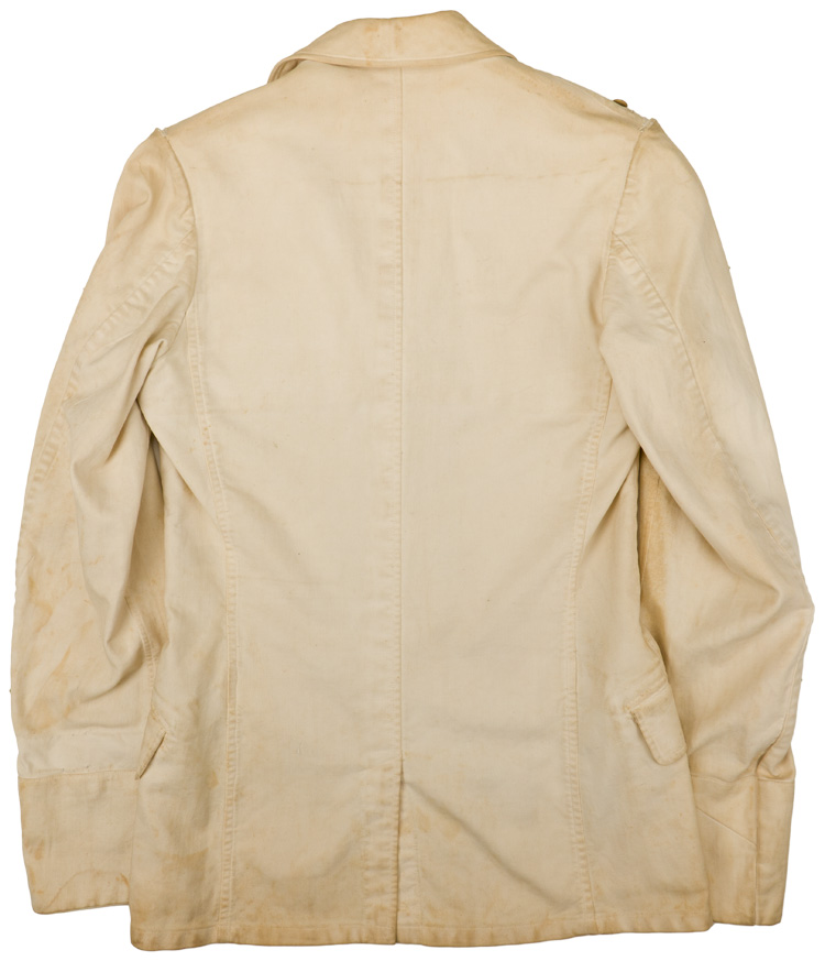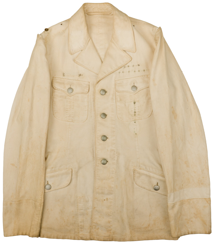 PHYSICAL DESCRIPTION: Ribbed white cotton constructed tunic with a four button, opened neck, front closure with small fold back lapels and lay down collar. Tunic has two inverted pleat patch breast pockets with scalloped button down flaps. Tunic also has two diagonally angled slash hip pockets with curved forward edge button down flaps. Simulated French cuffs. Right breast has two small holes where a metal breast eagle was removed. Awards loops for ribbon bars and a couple of badges remain. Sew on shoulder boards, collar tabs and a cufftitle have been removed. All the buttons are the silver washed, pebbled, alloy/sheet metal type. Tunic roughly size 36" chest.
