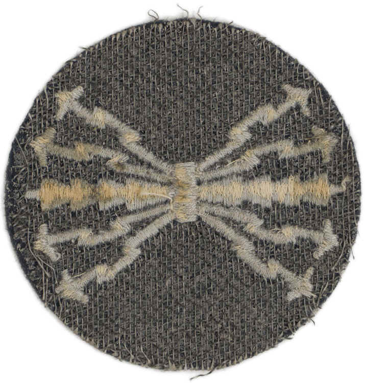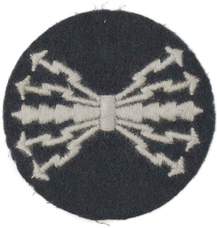 PHYSICAL DESCRIPTION: The badge consists of a roughly, 55mm diameter, Luftwaffe blue/grey wool construction base with a machine embroidered, central serrated horizontal bar with eight "lightening bolts" emanating diagonally outward from the center with four lightening bolts to the top and the other four to the bottom of the central bar, all in silvery/grey threads.