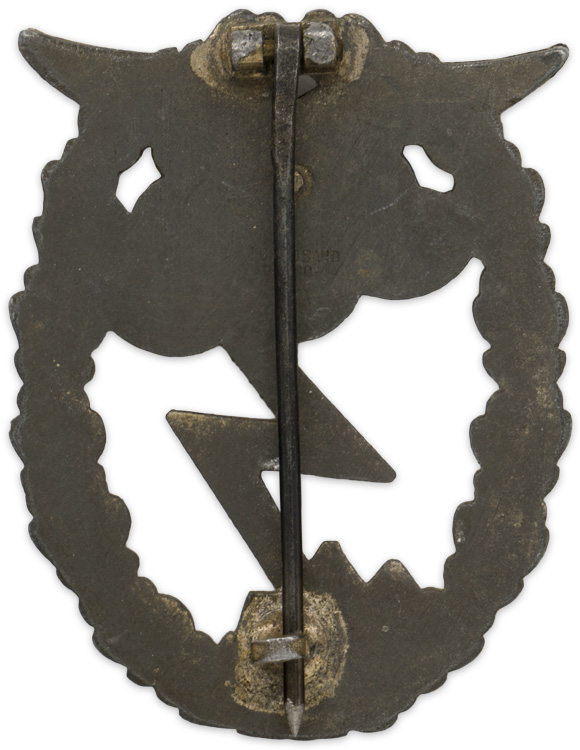 PHYSICAL DESCRIPTION: Die struck zinc/alloy, solid backed award in the form of a silver washed, vertically oval oak-leaf wreath with Luftwaffe eagle superimposed to top, encompassing a burnished matte grey washed cloud and lightning bolt. The reverse has a solid soldered hinge, a thin round vertical pin and catch all intact. The reverse is well marked with manufacturer's name and location, "G.H. Osang Dresden".
