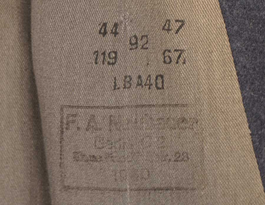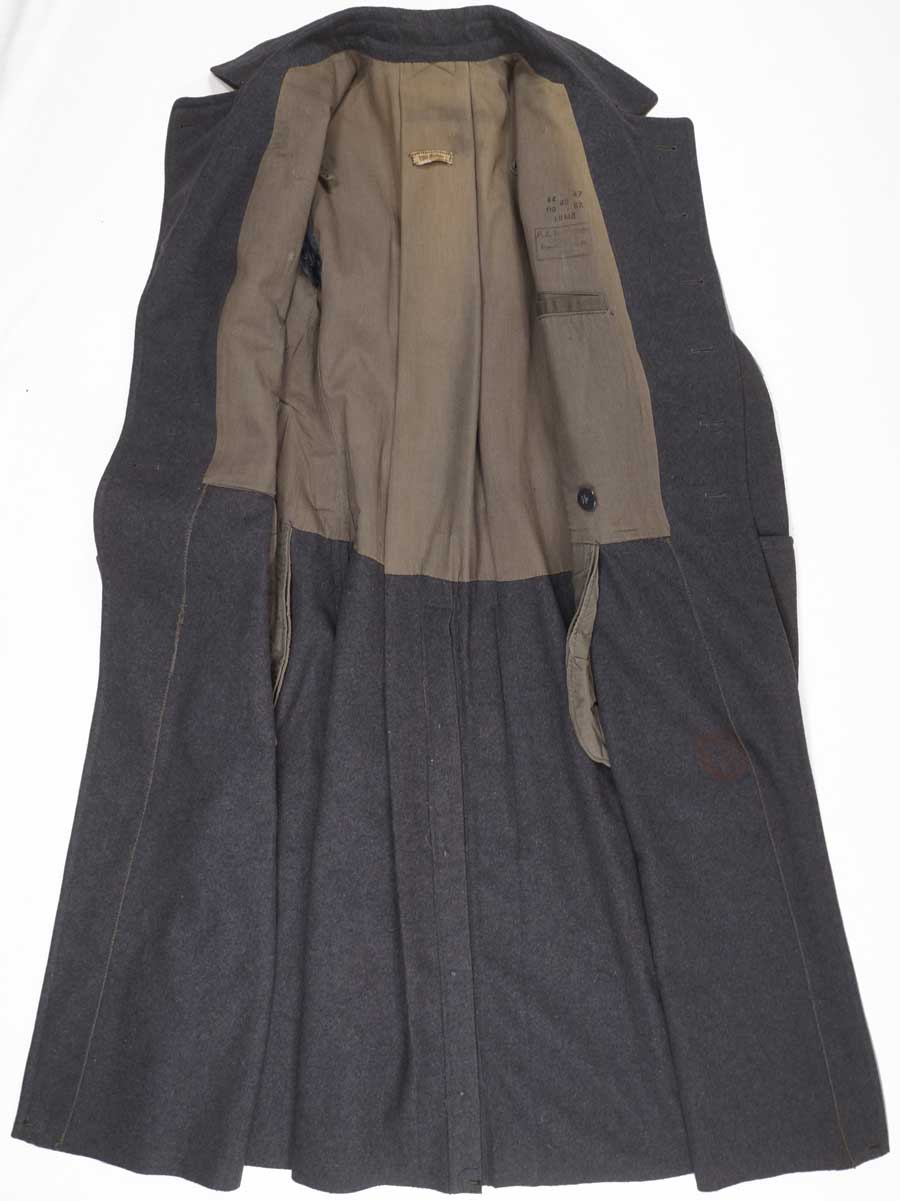 BACKGROUND: The Greatcoat was an essential uniform item worn by all ranks, with minor variations, and followed the basic design of the Imperial German army’s greatcoat. The Luftwaffe version of the greatcoat was first introduced by the DLV, Deutscher Luftsport Verband, (German Air Sports League), the clandestine, civil forerunner of the Luftwaffe, and was adopted for wear in the Luftwaffe on its inception in March 1935. During the war the standard issue greatcoat underwent a few minor modifications. The early production greatcoats came with button holes on both the left and right front closure panels which allowed the coat to be button up either left or right handedly and small metal hooks positioned at both sides of the bottom front closure panels, and additional small metal hooks positioned at both sides of the reverse tail skirt vent with corresponding thread loops situated at the side seams just below the waistline designed to allow the wearer to hook the tail skirt up out of the way when mounted or on the march. Both of these features were abolished by regulations of March 20TH 1940 although they were not strictly adhered to. Originally the buttons on the greatcoats for the ranks of Soldat to Oberst were silver finished while the ranks of Generalmajor to Reichsmarschall wore gilt finished buttons but just prior to the war buttons for the ranks of Soldat to Stabsfeldwebel were altered to a blue/grey finish. Unlike the army Luftwaffe personnel utilized collar tabs on their greatcoats until regulations of May 29TH 1942 abolished the collar tabs for EM/NCO personnel with the stipulation that they be removed by October 1ST 1942. Additional regulations of January 4TH 1943 reinstated the use of collar tabs on the greatcoat for EM/NCO personnel serving with Herman Göring Wacht Regiment Berlin, (Guard Regiment), and the Führer-Flakabteilung, (Führer Anti-Aircraft Battalion). Besides the standard greatcoat the Luftwaffe also introduced a heavy surcoat with an additional blanket lining for stationary personnel and drivers of opened cab vehicles and on October 17TH 1942 the Luftwaffe introduced the universal greatcoat that was intended to replace both the standard greatcoat and the surcoat but the change over was never complete and the standard greatcoat was worn through-out the war. Officers and certain senior NCO ranks were responsible for purchasing their own uniforms and as a result were allotted a clothing allowance through the Luftwaffe’s Verkaufsabteilung, (Air-Force Sales Department), system. The Officers and certain senior NCO’s could choose to purchase their uniforms from the armed forces clothing depots or to privately purchase garments of higher quality. Although enlisted personnel were issued their uniforms from government supplies they were also permitted to purchase privately tailored uniforms although the price may have been restrictive.