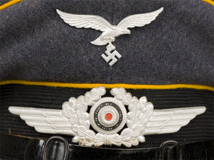 BACKGROUND: Visor caps were a standard item for all military personnel during the Third Reich period, (Circa 1933-1945), and regulations dictated the form of dress they were to be worn with, based on the individual’s rank. On its inception on February 26TH 1935, the Luftwaffe, (Air-{Weapon}, Force), adopted most of the uniform items of the earlier DLV, Deutscher Luftsport Verband, (German Air Sports Association), the clandestine, civilian forerunner of the Luftwaffe, including the visor cap. In March 1935 the earlier, "Tellerform", saucer shaped, caps were replaced with a new a "Sattelform" saddle shaped, cap with a higher front peak and an oval shaped top. The insignia utilized on the visor caps consisted of the Luftwaffe style national eagle as introduced for wear by Fliegerschaft, (Pilot Base), personnel of the DLV on August 18TH 1934 and was officially adopted for wear by all Luftwaffe personnel on March 1ST 1935 along with a new, winged, wreath and the national tri-color cockade. The original, first pattern, Luftwaffe style, national eagle was utilized until a slightly modified, second pattern national eagle was introduced in late 1936 or early 1937. The visor caps for Company and Field grade Officers, holding the ranks of Leutnant up to Oberst were distinguished from EM/NCO’s caps by bright, silver/aluminum piping and a silver/aluminum chin cord while Officers holding Generals ranks of Generalmajor up to Reichsmarschall utilized gold colored fittings. EM/NCO ranks visor caps utilized the appropriate waffenfarbe, (Branch of Service Color), piping and blackened leather chinstraps. Officers and certain senior NCO ranks were responsible for purchasing their own caps and as a result were allotted a clothing allowance through the Luftwaffe’s Verkaufsabteilung, (Air-Force Sales Department), system. The Officers and certain senior NCO’s could choose to purchase their caps from the armed forces clothing depots or to privately purchase visor caps of higher quality. Although enlisted personnel were issued their caps from government supplies they were also permitted to purchase privately tailored caps although the price may have been restrictive. The different branches of service within the Luftwaffe were allocated a specific, identifying, waffenfarbe, (Branch of Service Color), with golden yellow being chosen for Flieger, (Flight), personnel which was displayed as piping on EM/NCO’s visor caps.