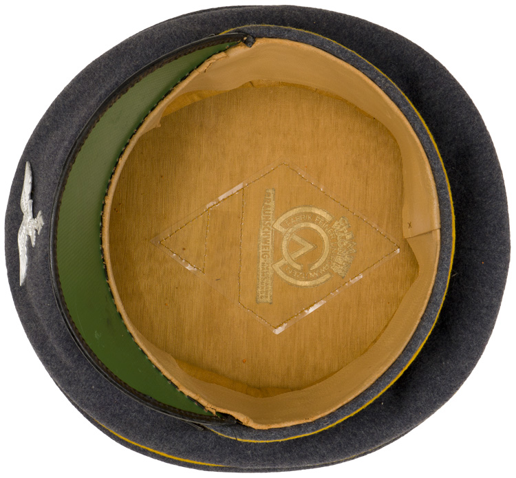 PHYSICAL DESCRIPTION: Nice quality, privately purchased, Luftwaffe blue/grey, wool construction visor cap, features a black, horizontally ribbed, interwoven, mohair centerband, and golden yellow wool waffenfarbe piping to the crown edge and both the top and bottom edges of the centerband. The front center of the cap has second pattern, (Circa 1936/1937-1945), silver washed, stamped alloy, Luftwaffe eagle clutching a canted, swastika in it’s talons. The front center of the centerband has a silver washed, stamped alloy, winged wreath with a black, silver and red painted national tri-color cockade. The cap has a black, patent leather chinstrap with two, black painted sliding length adjustment buckles. The chinstrap is secured to the cap by two, smooth, black painted, magnetic sheet metal buttons. The cap has an extended, forward, black lacquered, visor with a machine stitched, simulated leather lip to the forward edge. The interior of the cap is fully lined in orangish/tan cheesecloth. The crown lining has a clear celluloid sweat diamond with a small, opened ended, "pocket" near the forward edge, fully intact. Very nice maked to . The cap is a roughly size 55/56. Nice unit marking under the swearband. Nice untouched original example.