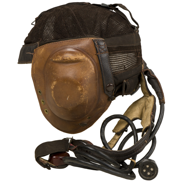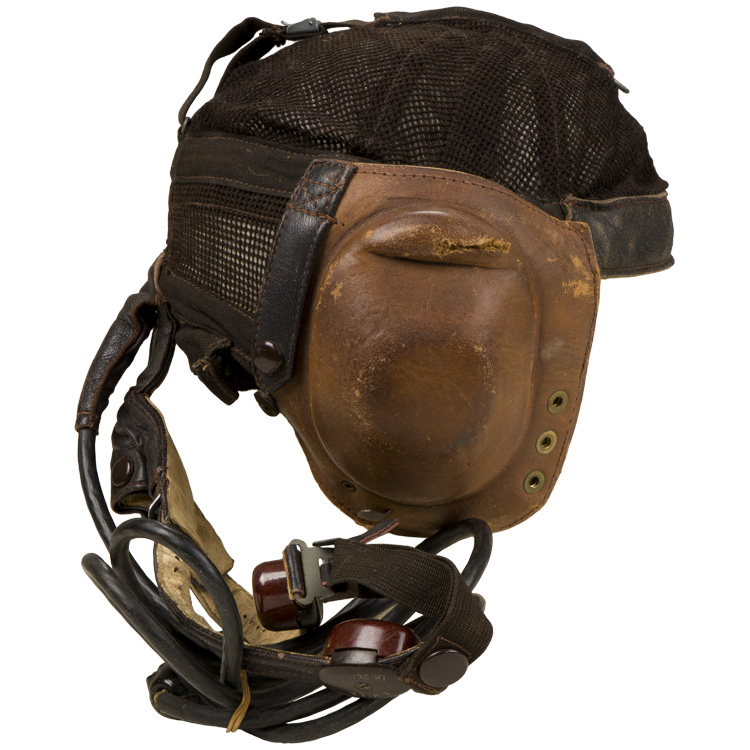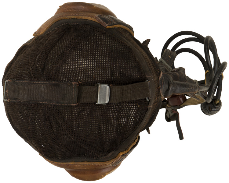 PHYSICAL DESCRIPTION: Early pattern, brown cotton mesh net construction flight helmet with brown and tan leather fittings and bakelite communications equipment. The helmet features a fine cotton mesh net to the crown and back with three, internal, vertical, reinforcement strips of brown HBT cotton and an additional two exterior, horizontal, brown HBT cotton reinforcement strips. The helmet has tan leather covered earphone mounts with a grooved lip to the top edges to secure the goggle straps in place. The reverse of the earphone mounts each have an external, vertical, brown leather strap with a single snap closure, also for securing the goggle straps. The reverse nape of the neck of the helmet has two horizontal fabric covered springs for a secure fit. The reverse center of the helmet has a vertical leather attachment for the larynx microphone and electrical cord with a break coupling plug. The "Mi 4c" larynx microphone, features dual, horizontal, leather, fit adjustment straps with dual pronged sheet metal buckles and two bakelite microphones with single snap closure retaining straps are all intact. The short, black rubberized plug in electrical cord terminates in a molded bakelite, four pronged, break coupling, plug which is also intact. The forward edges of the leather earphone mounts each have three vertically aligned inset sheet metal grommets. The grommets were designed to accepted a single, screw in, stud to each side for fastening the oxygen mask with the remaining two grommets available for fit adjustment. The central grommets to each side have a screwed in stud. The interior of the helmet is lined at the forehead, the top central seam and the nape of the neck in light tan chamois and the earphone mounts are lined in white fleece. Complete label. Maker marked to "hdc", size marked "57". Nice complete example.