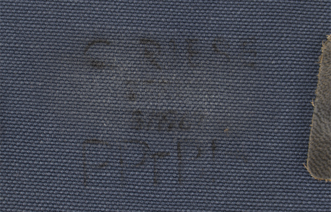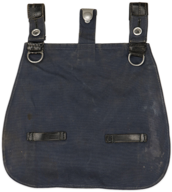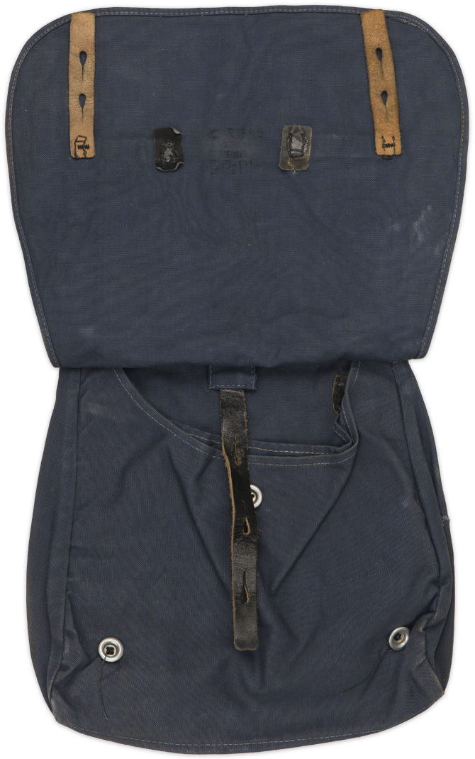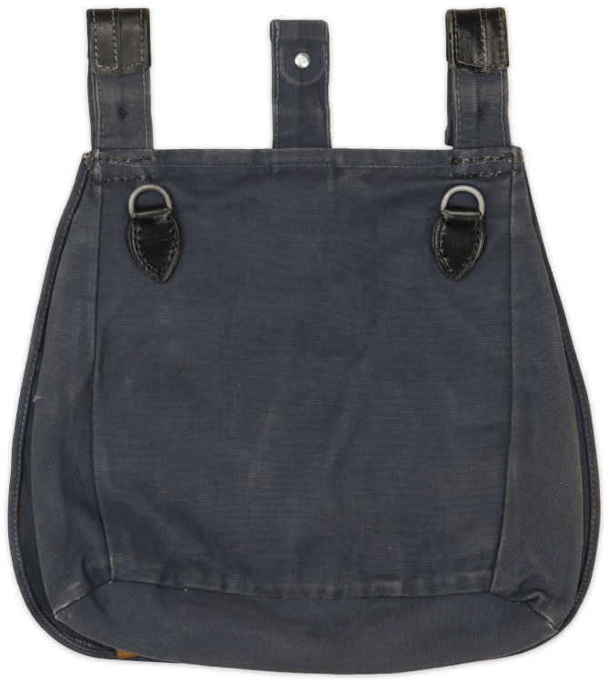 Luftwaffe blue/grey water repellent, canvas construction bread bag with leather, steel and natural alloy fittings. All complete. Very similar to the WW2 type.