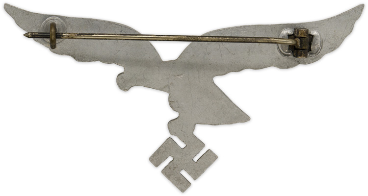 PHYSICAL DESCRIPTION: Silver washed, injection molded, solid backed, aluminum alloy construction, second pattern, (Circa 1937/38 1945), Luftwaffe breast eagle clutching a canted, swastika in it’s talons. The eagle shows nice detailing and has a wingspan of roughly, 85mm from wing tip to wing tip. The solid reverse has an integral hinge, a thin round horizontal pin and catch with a circular base plate all intact.