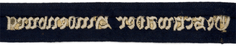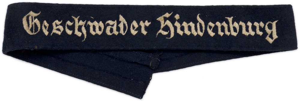 PHYSICAL DESCRIPTION: Roughly 38mm tall, 48cm long, woven, deep navy blue, wool construction, EM/NCO’s cufftitle with machine embroidered, Gothic styled script, "Geschwader Hindenburg", in light grey threads. The cufftitle has the typical opened back construction with machine stitched seams to both the top and bottom edges. Small tear/hole close to the right edge bit otherwise excellent. Both ends of the cufftitle are folded and stitched to the reverse.