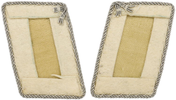 BACKGROUND: The Reichsluftwaffe was officially established on February 26TH 1935 as the third branch of service of the German Armed Forces. On March 9TH 1935 the formation of the new Reichsluftwaffe was announced to the foreign press and on March 16TH conscription was reintroduced for all three branches of service. On May 21ST 1935 the Reichsluftwaffe designation was altered to Luftwaffe. Collar tabs were adopted by the newly formed Luftwaffe on April 14TH 1935 and followed the basic pattern of the collar tabs that had been utilized by its earlier civilian forerunner the, DLV, Deutscher Luftsport Verband, (German Air Sports League). The collar tabs were worn in matching pairs and indicated the branch of service and rank of the wearer. The Regiment General Göring was formed in September 1935 from the previous Landes Polizei Gruppe General Göring, and became the premier unit of the fledgling Luftwaffe. On March 12TH 1936 the unit exchange their Police uniforms for Luftwaffe uniforms, and it was at this time that personnel were issued the distinctive white waffenfarbe, (Branch of Service Color), collar tabs. The unit went through assorted upgrades and enlargements until October 1942 when it was designated Division Hermann Göring, and retained the right to wear the white collar tabs. Of Note: Regulations of January 4TH 1943 introduced additional branch of service colors for personnel of the Hermann Göring units and further regulations of April 2ND 1943 abolished the collar tab piping.