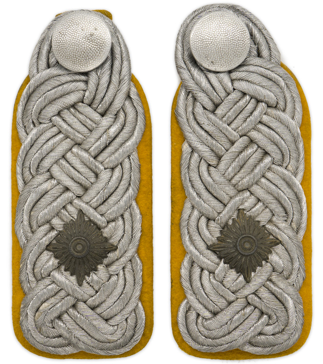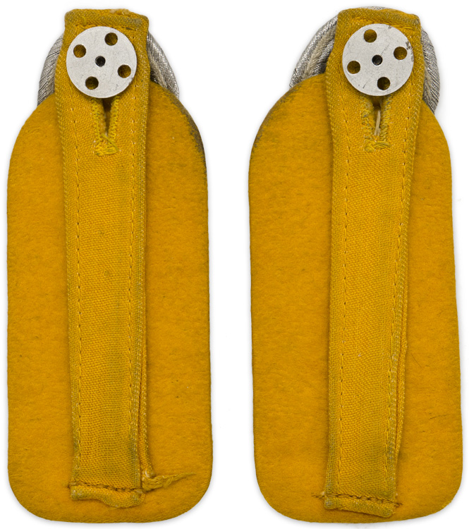 PHYSICAL DESCRIPTION: Slip on shoulder boards in interwoven, bright, silver/aluminum Russian braiding with a single stamped alloy, rank pip to each mounted on golden yellow wool waffenfarbe bases. Original buttons included.