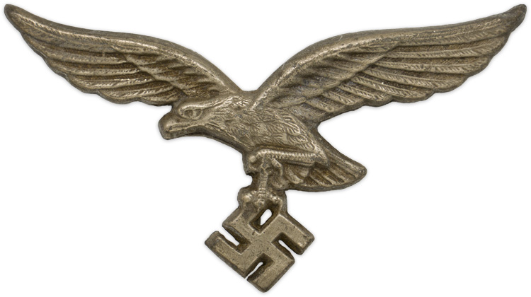 PHYSICAL DESCRIPTION: Silver washed, stamped alloy construction, second pattern, (Circa 1936/1937 1945), Luftwaffe eagle clutching a canted, swastika in one talon has a roughly, 68mm wingspan from wing tip to wing tip. All three original attachment prongs complete. Scarce.