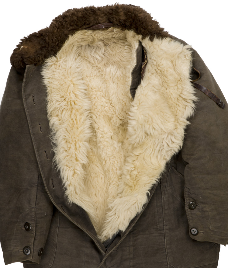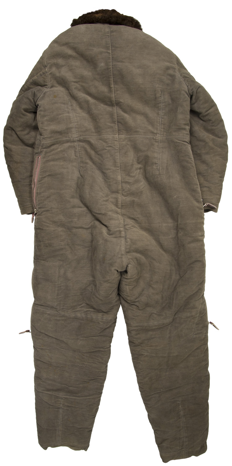 PHYSICAL DESCRIPTION: Scarce example of a early war Luftwaffe winter worn flight suit or "Fliegerschutzanzug fur Winter." Features all of its original bakelite buttons, metal snaps and functional zippers (all corrosion free and complete with there leather sewn handle tabs). The suit is constructed in a grey velveteen fabric that is consistent throughout with a few areas showing shallow holes of moth nips across the fabric. What is most prominent is a tear sustained on the lower right side pocket. The collar is faced with a dense brown fur that shows appropriate signs of age. Underneath the collar are complete with its double snap closure and straps. The suit is lined with a white course fur that is well retained throughout the interior. Underneath the large button placket remains an ink stamp that reads "Gr. Ia" indicating the size of the suit along with its Luftwaffe inspection stamp and manufacturer label that reads "Karl Heisler, Berlin C2". Also to make note is the half meter emergency ripcord system that are unique on these suits. This is one is all intact having that hidden pull ring still attached, not always common. These