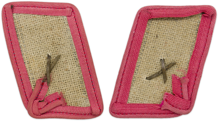 PHYSICAL DESCRIPTION: Field grey wool tabs with pink rayon waffenfarbe, and silver washed stamped alloy deaths heads.