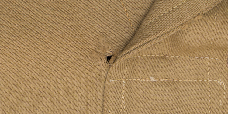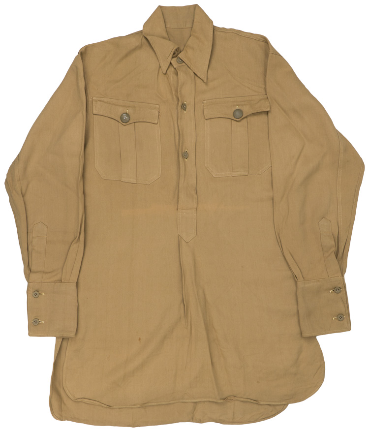 PHYSICAL DESCRIPTION: Early pattern, light weight, tan cotton construction, long sleeve, pullover shirt with an integral lay down collar. The shirt features a vertical, three button, front closure plaquet which runs from the neckline down to the waistline. The shirt has two pleated, patch, breast pockets with scalloped button down flaps. Buttons all look to be original stitching. Roughly a size 38" chest.