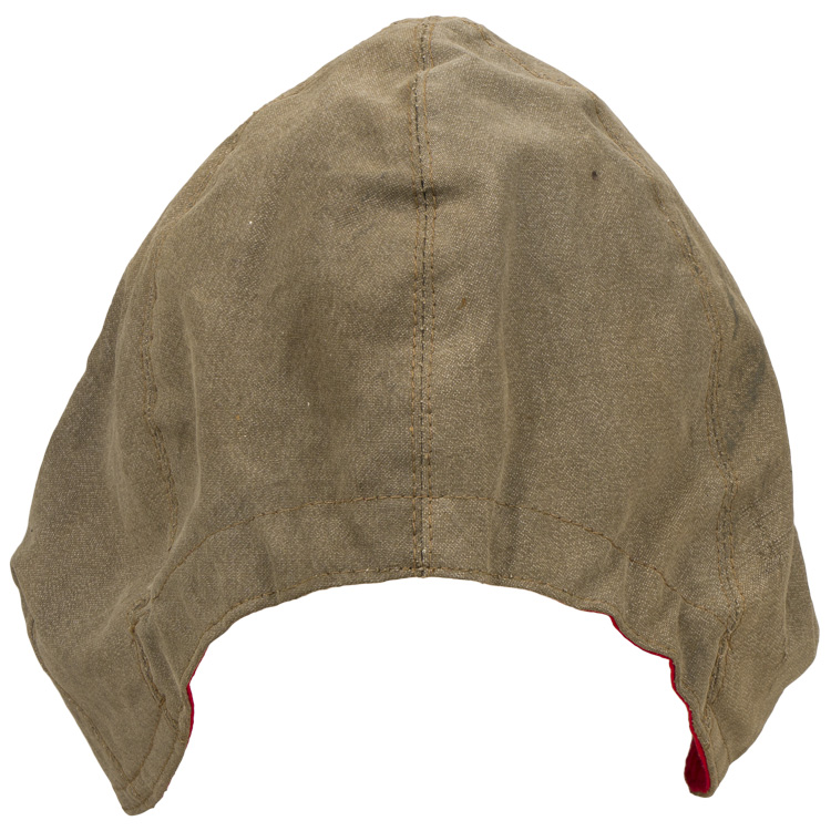 PHYSICAL DESCRIPTION: Reversible, six panel, light weight, dual-ply, mottled tan cotton and bright red, cotton/rayon blend construction protective flight helmet cover with machine stitched seams. One side of the cover is in bright red, cotton/rayon material while the other side is in mottled tan cotton. The cover has two, small, forward and back triangular panels and two larger, unique shaped side panels all with machine stitched seams. The side panels of the cover each have downward extended, semi-circular contours to fit over the earphones mounts. The red side of the cover is well marked with the black inkstamped size, "Gr.2", (Medium). Scarce protective flight helmet cover.